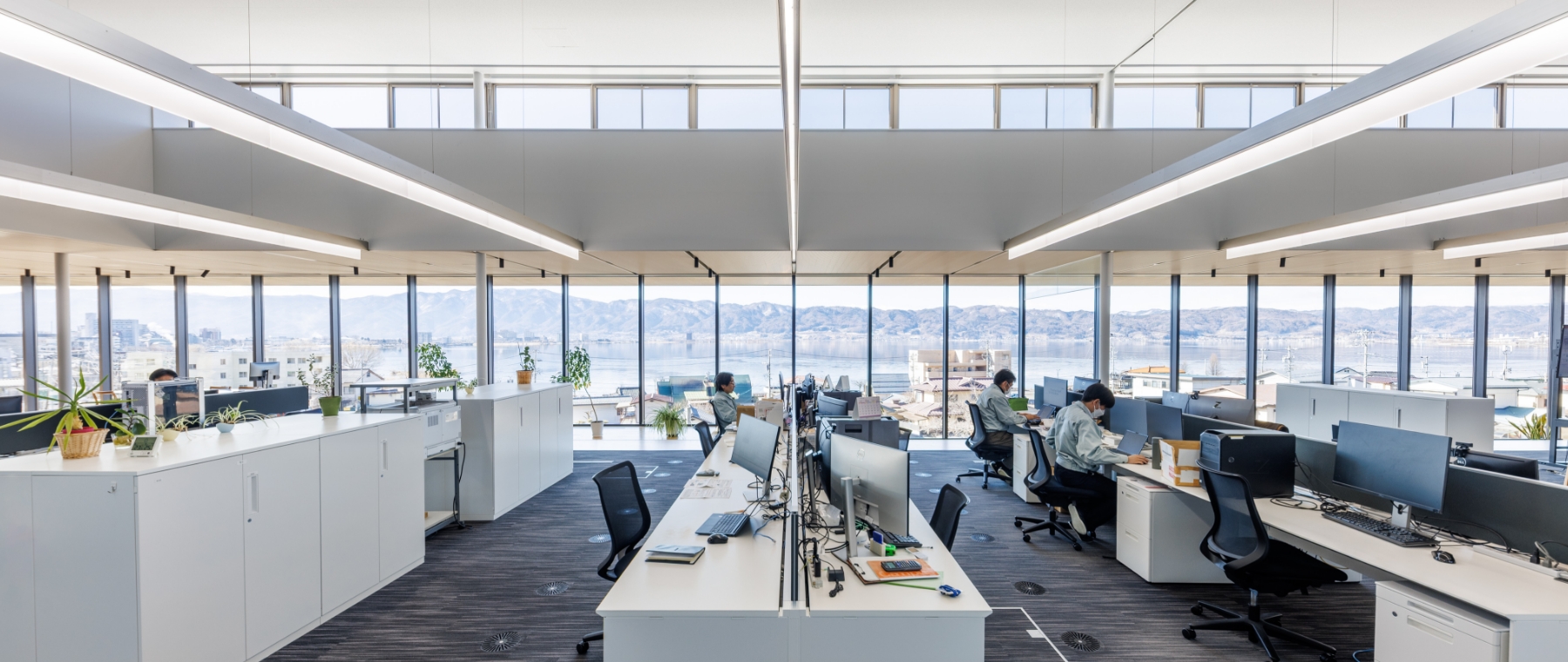 諏訪技術センターは、自然のロケーションを最大限に活かした、宙空に浮かぶようなデザイン。あらゆる場所から諏訪湖や日本アルプスを望む圧倒的な開放感と、広々としたワークスペースが大きな魅力です。ワンフロアの中で執務室と充実した実験室がシームレスにつながっているので、技術者たちは「発想」と「検証」をストレスなくつなげることができます。